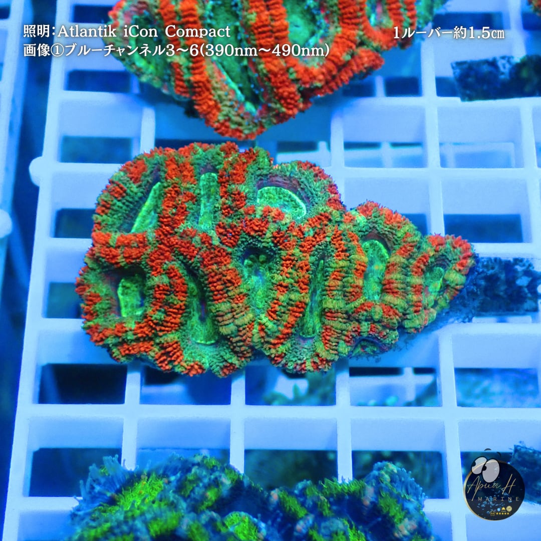 ・センターは蛍光感の強いグリーンアイ、外周には細かな粒状ポリプのレッドが帯状に並ぶハイコントラスト個体