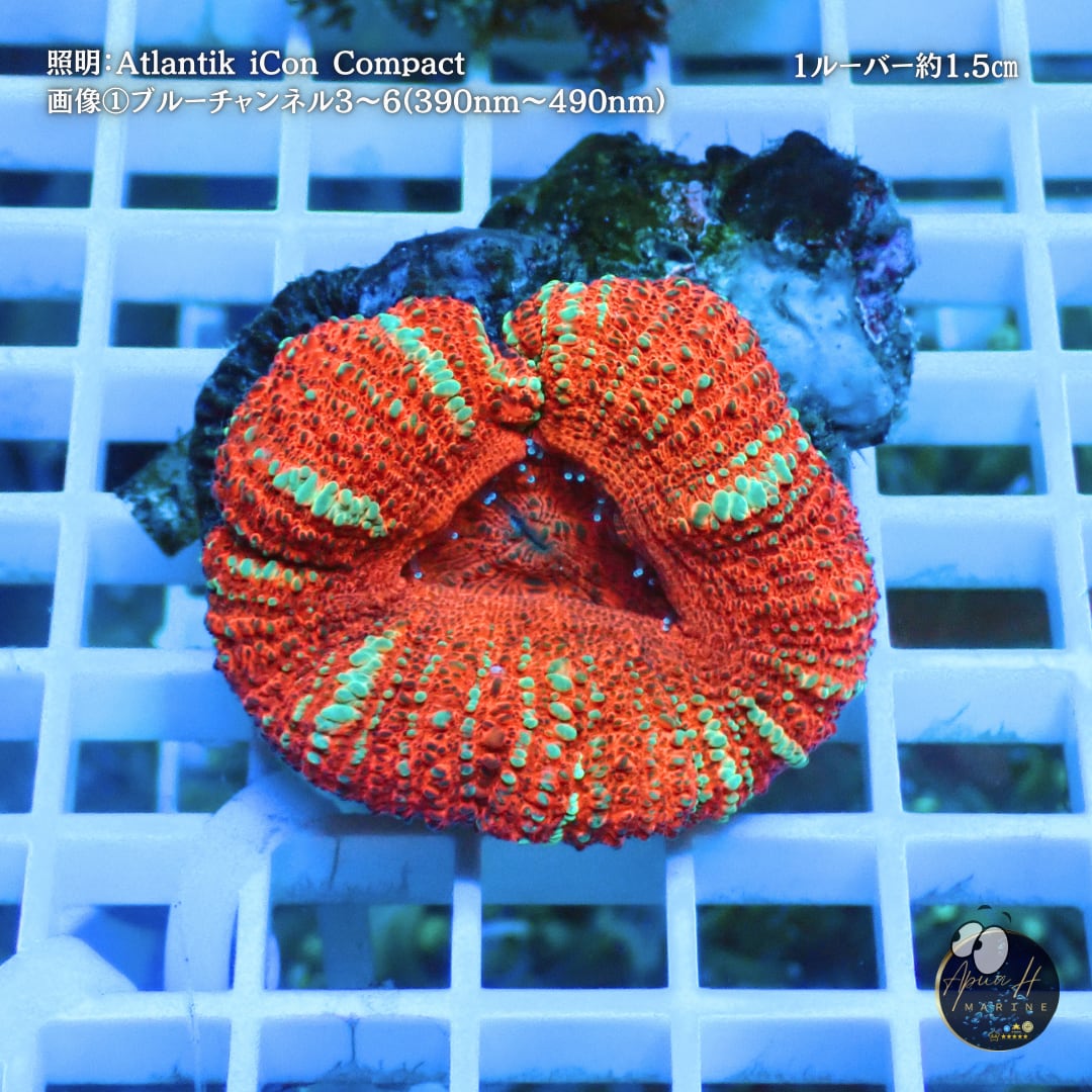 ・ブルーチャンネル下ではオレンジ部分が強く蛍光し、グリーンスポットが宝石のように浮かび上がるハイコントラスト発色