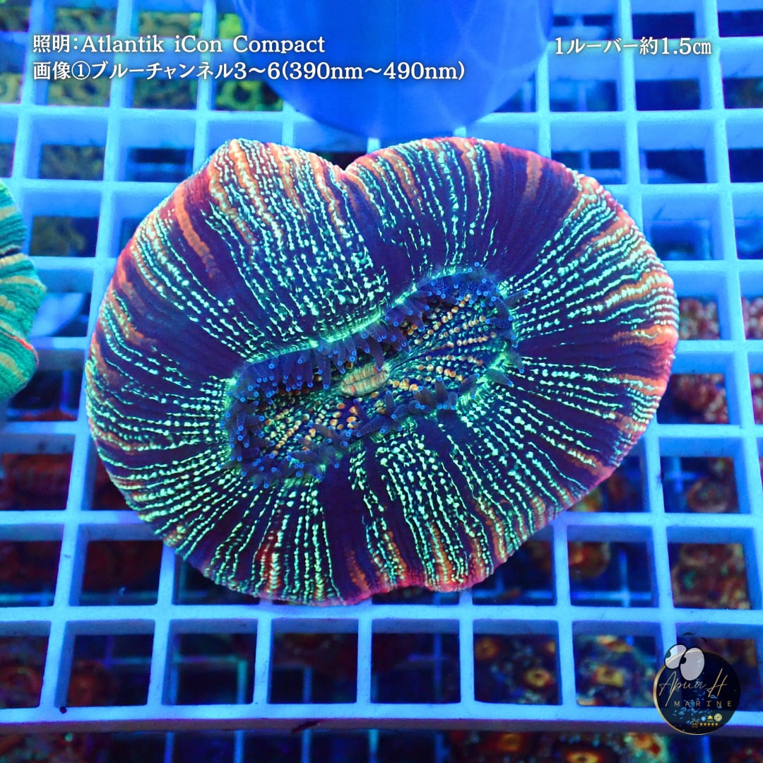 ・ポリプカラー:ブルーチャンネルではディープレッド〜パープル系のボディに、蛍光グリーンの極細ストライプがびっしり走る“ネオン銀河”のようなカラーリング