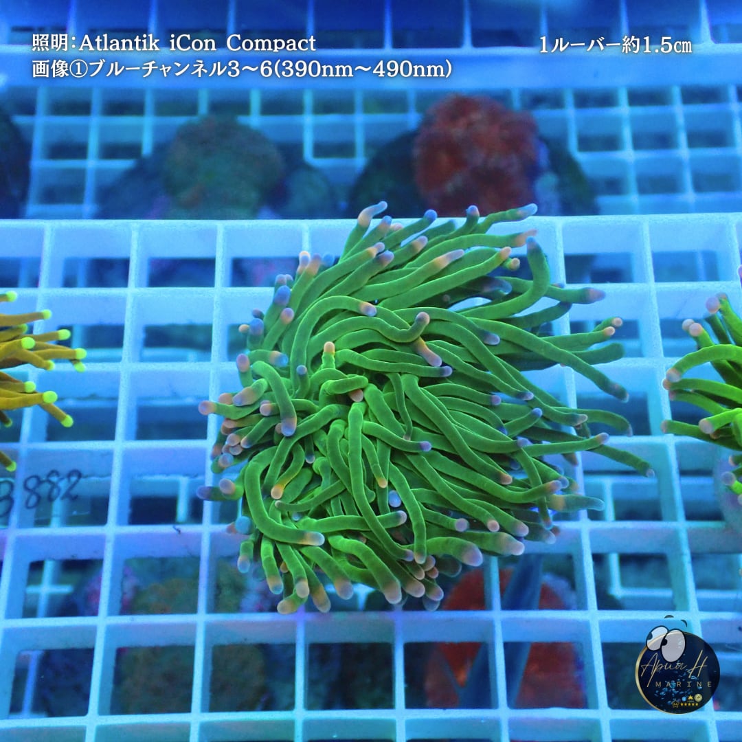 ・ポリプカラー:ブルーチャンネルではポリプ全体がネオングリーンに強く発光し、白チャンネルでは落ち着いたミントグリーン〜ライトグリーンに見えるキャンディーライクなカラー。